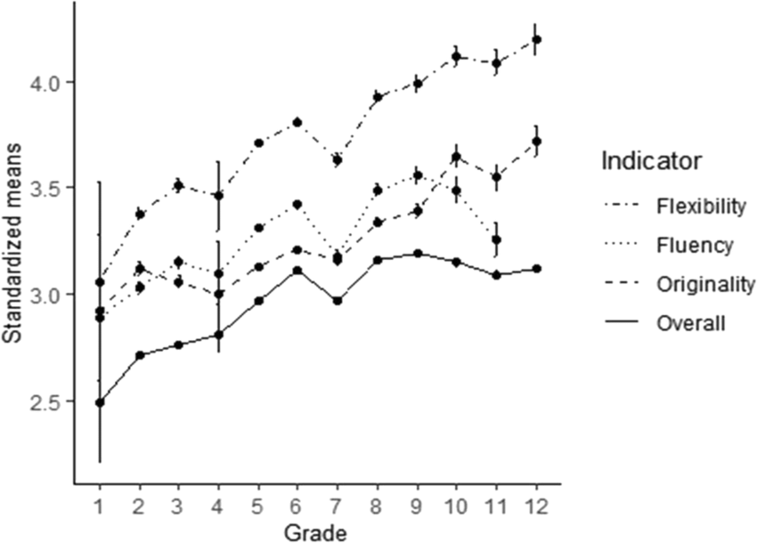 Developmental trends of divergent thinking indicators by grade with corresponding standard errors (Said-Metwaly, Fernández-Castilla, Kyndt, Van den Noortgate, Barbot, 2021)